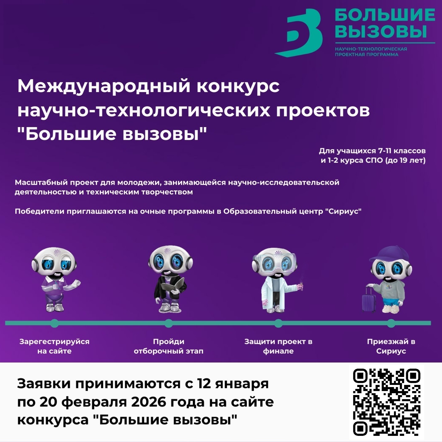 Регистрация (12 января 2026 г.-20 февраля 2026 г.): На платформе Сириус необходимо заполнить онлайн-заявку, и приложить проект. Ссылка для регистрации: my.sirius.online/activity-page/sirius:great-challenges-2026-participant